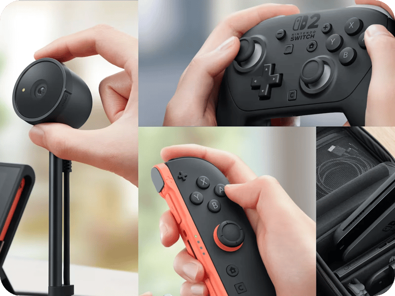 Nintendo Switch 2 erbjuder en rad tillbehör för att förbättra spelupplevelsen. Bland dessa finns den nya Nintendo Switch 2 Pro Controller med HD-rumble och anpassningsbara knappar, samt Joy-Con 2-kontroller med avancerade funktioner som rörelsekontroller och musstyrning. För mer detaljerad kontroll finns Joy-Con 2 Wheel för racing och Joy-Con 2 Charging Grip som både laddar och fungerar som en klassisk kontroller. Tillbehör som Joy-Con 2 Straps ger extra stabilitet under spel.