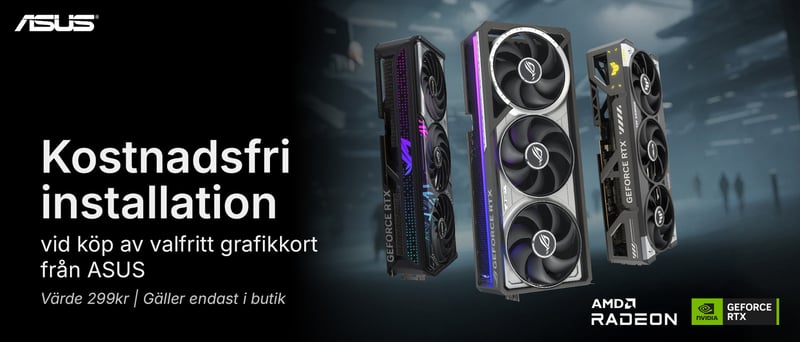 Om det är dags att uppgradera grafikkortet i datorn så kan vi glatt meddela att vi kör en favorit i repris med ASUS. Under april månad hjälper vi nämligen dig som köper ett ASUS-grafikkortet på plats i en av våra butiker att byta grafikkortet, helt gratis (värde 299 kr). Så här går det till:
