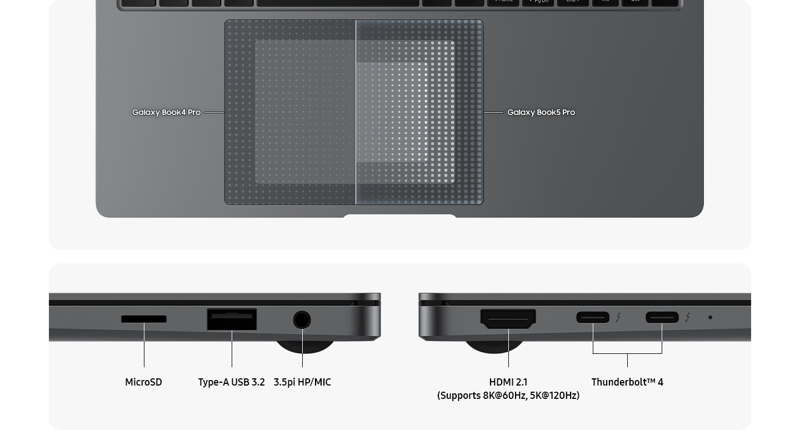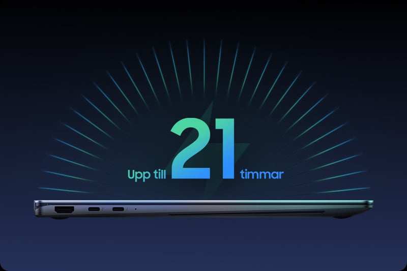 Ett högeffektivt batteri i kombination med optimerad energihantering ger upp till cirka 21 timmars videotid på en enda laddning. Snabbladdningsstöd ger betydande batteriökning på kort tid, vilket snabbt får dig tillbaka i arbete. Med en vikt på 1,23 kg och en tunn profil på 11,6 mm är Galaxy Book5 Pro lätt att ta med sig i väskan utan att tumma på prestandan.