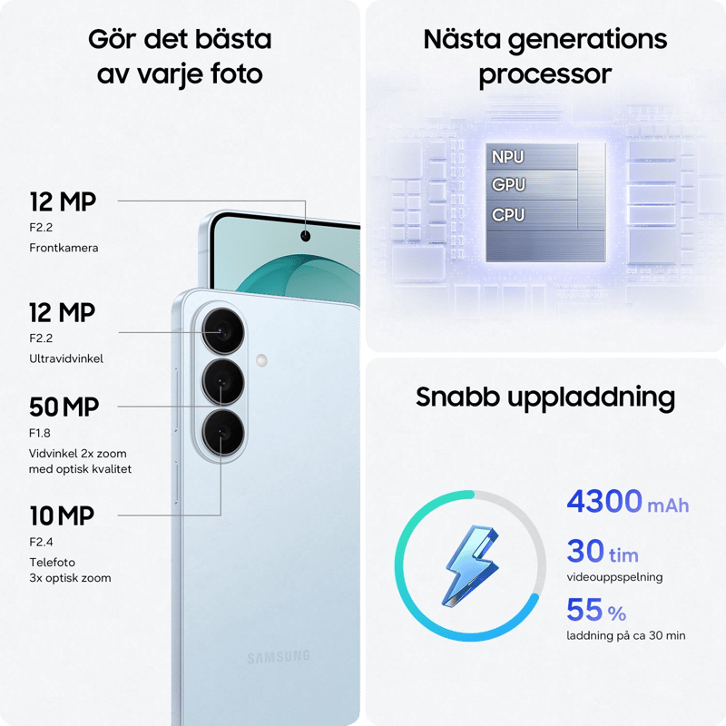 Den kraftfulla 2 nm Exynos-processorn levererar maximal AI-prestanda, blixtsnabb gaming och sömlös multitasking. Allt upplevs på en ljusstark 6,3 tum AMOLED-skärm med adaptiv 120 Hz som gör rörelser skarpa och färger levande. Det intelligenta 4300 mAh-batteriet optimerar energin efter ditt användande och räcker hela dagen.