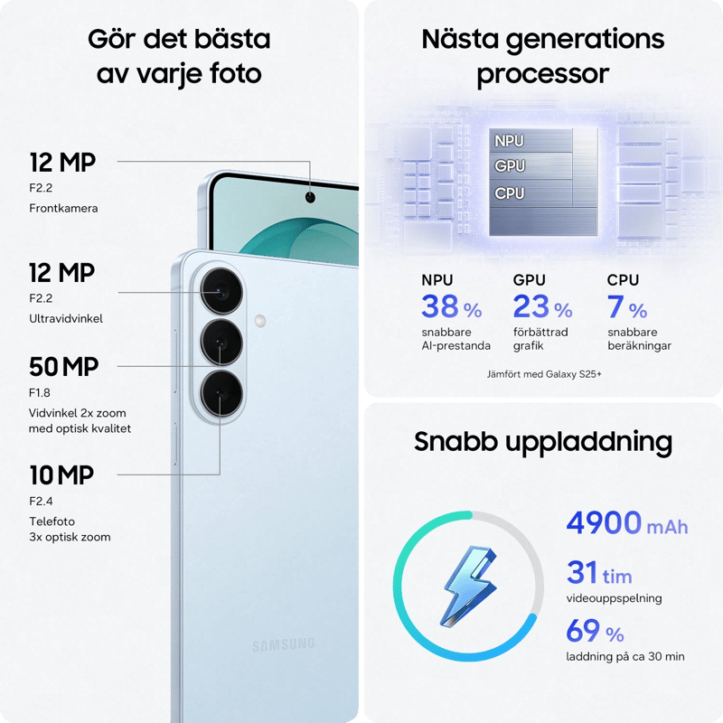 Den kraftfulla 2 nm Exynos-processorn levererar maximal AI-prestanda, blixtsnabb gaming och sömlös multitasking. Allt upplevs på en ljusstark 6,7 tum AMOLED-skärm med adaptiv 120 Hz som gör rörelser skarpa och färger levande. Det intelligenta 4900 mAh-batteriet optimerar energin efter ditt användande och räcker hela dagen.