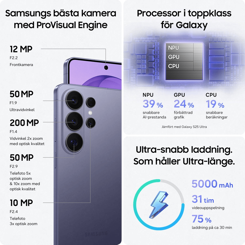 Med Snapdragon 8 Elite Gen 5 for Galaxy får du kraftfull AI-prestanda, snabb gaming och smidig användning. Den ljusstarka 6,9″-skärmen med upp till 120 Hz ger skarpa rörelser och levande färger. 5000 mAh-batteriet räcker hela dagen och laddas till 75 % på 30 minuter. Upp till 1 TB lagring ger plats för allt du vill spara.