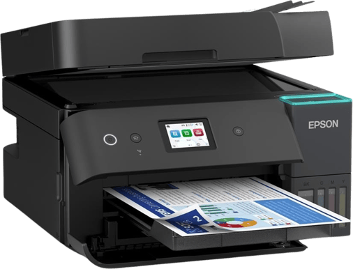 De inbyggda bläckbehållarna har mycket hög kapacitet och fylls enkelt på med nyckellåsta flaskor som förhindrar spill och fel färg. Medföljande bläck räcker för upp till cirka 15 100 sidor i svartvitt och 5 500 sidor i färg, vilket motsvarar flera års normal användning. En tydlig bläcknivåindikator på framsidan gör det enkelt att planera påfyllning utan överraskningar.