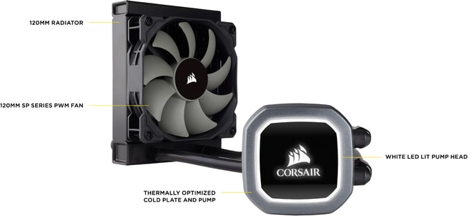 H60 (v3) är kompatibel med bl.a. AM4, LGA 115x och LGA 2066, och kombinerad med en 120mm Corsair SP PWM-fläkt kan användaren justera fläkthastigheten från 600 till 1700 rpm för precis kontroll av ljud och luftflöde.