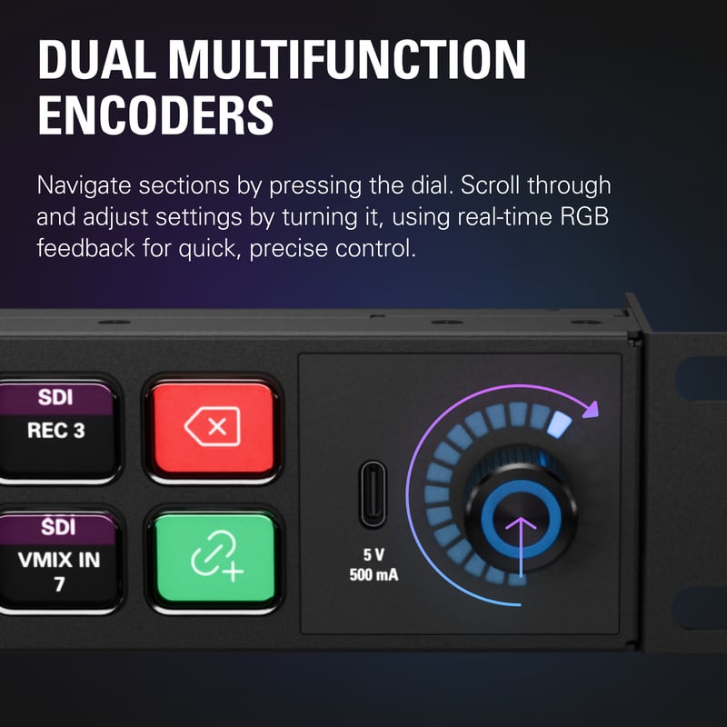 Varje kontroll kan konfigureras efter specifika arbetsuppgifter och användarroller. Encoders med realtidsfeedback lämpar sig för nivåjustering, parameterstyrning och fintrimning, medan mappar, lager och popover-menyer gör det möjligt att samla många funktioner utan att kompromissa med överskådlighet. Detta ger snabb navigation även i omfattande produktioner med många samtidiga moment.