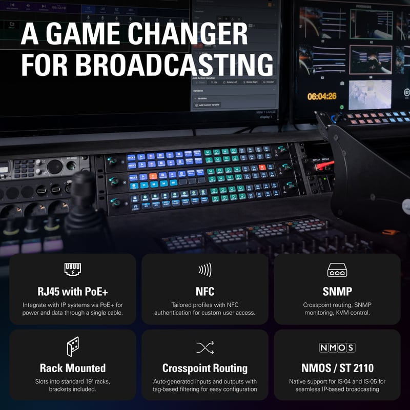 Stream Deck Studio är utvecklad för moderna broadcastmiljöer där flexibilitet, driftsäkerhet och snabb åtkomst är avgörande. Enheten fungerar som en central kontrollpunkt för routing, styrning och övervakning i både små och stora produktionssystem. Tack vare stöd för både IP-baserade protokoll och traditionell SDI integreras Stream Deck Studio sömlöst i befintliga installationer utan att kräva omfattande ombyggnad av infrastrukturen.