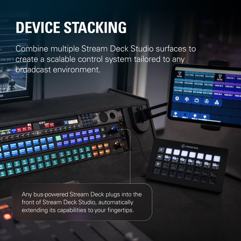 Tillsammans med Bitfocus Buttons erbjuder Stream Deck Studio ett visuellt och logiskt arbetssätt som är anpassat för broadcasttekniker. Gränssnittet speglar den fysiska ytan med 32 programmerbara LCD-knappar och två 360°-encoders med tryckfunktion och LED-ring. Arbetsflöden byggs snabbt upp, justeras i realtid och återanvänds mellan produktioner, vilket minskar risken för fel i kritiska moment.