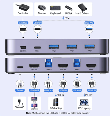 Denna USB KVM Switch är utrustad med tre USB 3.0-portar samt en USB-C-port för delning av kringutrustning. Du kan ansluta tangentbord, mus, externa hårddiskar, USB-minnen och skrivare och växla dem mellan två datorer.