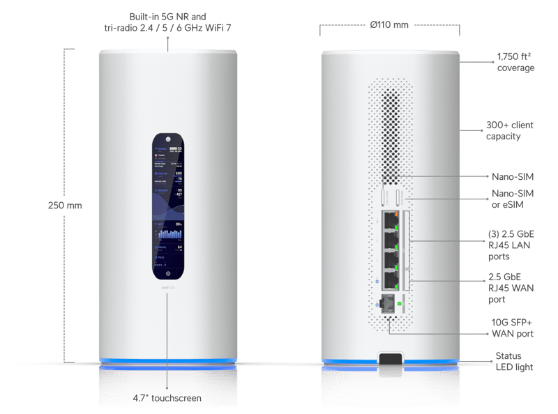 Dream Router 5G Max är en avancerad UniFi Console som kombinerar router, accesspunkt och säkerhetsplattform i en och samma enhet. Med stöd för WiFi 7, integrerat 5G-modem och högpresterande WAN-alternativ är den anpassad för både hem och mindre kontor med höga krav på tillgänglighet och prestanda.