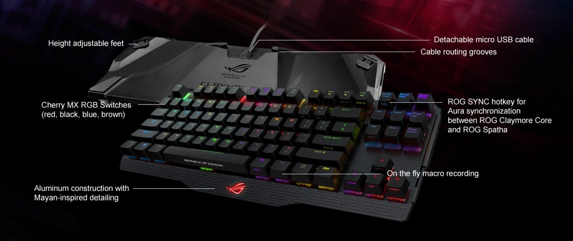 ROG Claymore Core kommer utrustade med Cherry MX RGB brytare för precisa och responsiva mekaniska tangenter. Tangenterna är även individuellt programmerbara och bakgrundsbelysta med Aura RGB synkronisering för obegränsade anpassningsmöjligheter. Claymore Core har 100% anti-ghosting och N-Key rollover, enkel makro-inläsning and dedicated snabbknappar förkylning och överklockning på ASUS moderkort. ROG Claymore Core ger dig verkligen den vinnande fördelen på det digitala stridsfältet!