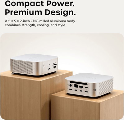 - SSD-kabinett: 1 x M.2 NVMe (PCIe 4.0 x4), stödjer 2230, 2242, 2260, 2280; upp till 8 TB; upp till 6000 MB/s (SSD ingår ej) Strömförsörjning: DC via 180 W nätaggregat