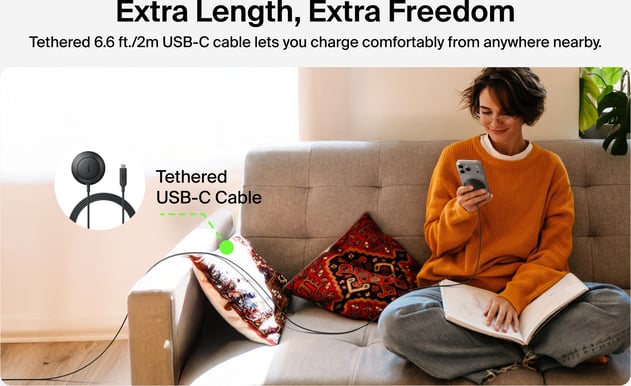 Den fasta USB-C-kabeln på 2 meter ger flexibilitet vid placering och användning. Laddaren är kompatibel med Apple-enheter, MagSafe, Android och andra Qi2-certifierade enheter. Den fungerar även med de flesta mobilskal, vilket eliminerar behovet av att ta bort fodral vid laddning.