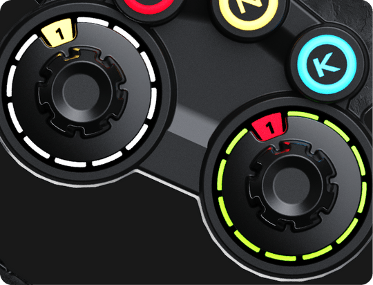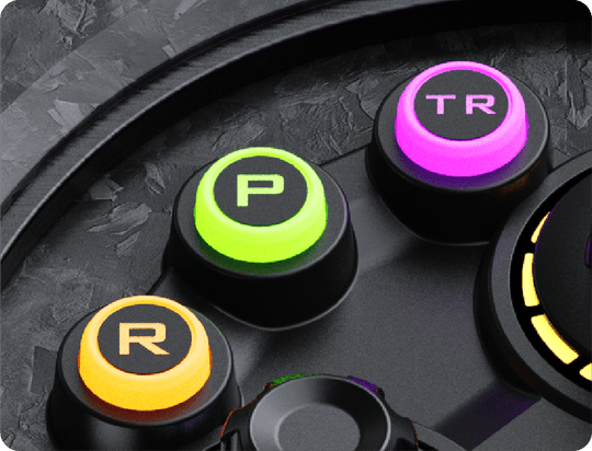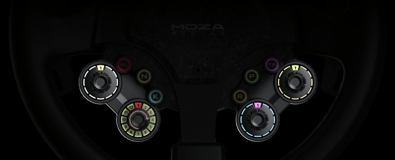MOZA CS Pro Wheel är utrustad med ett omfattande inmatningssystem bestående av 8 RGB-bakbelysta knappar, 4 tolvläges roterande encoders, 2 sjuvägs funky switches, 2 tumhjul samt 2 bakre knappar. Fyra RGB-rotary switches med upp till 16,7 miljoner färger ger snabb visuell identifiering av fordonsinställningar. Dessutom finns 10 RGB-varvljus och 6 RGB-flaggljus som kan konfigureras för RPM, flaggsignaler eller andra telemetrivärden.