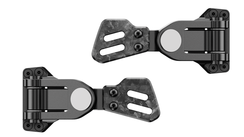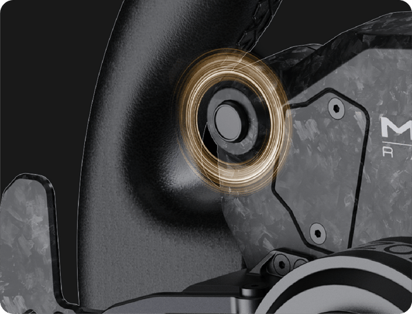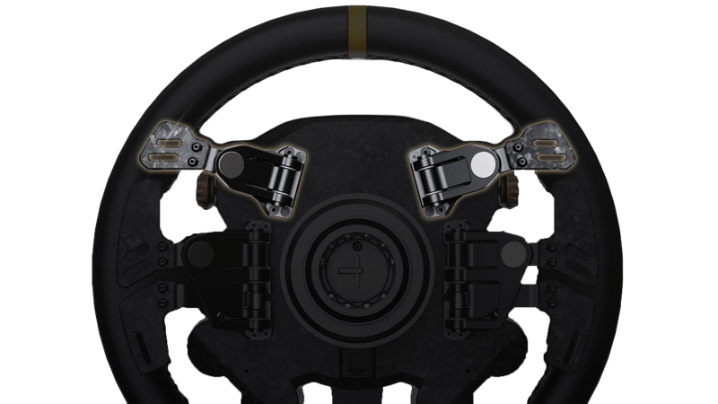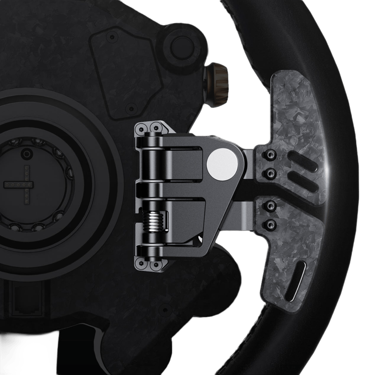 Växelpaddlarna är tillverkade i smidd kolfiber och använder hall-sensorer för konsekvent och exakt aktivering. Den magnetiska mekanismen ger tydlig återkoppling utan mekaniskt slitage. De dubbla kopplingspaddlarna kan konfigureras som dual clutch, single clutch eller helt programmerbara ingångar. För avancerade användare finns stöd för uppgradering till sex paddlar för funktioner som DRS, KERS eller justering av bilinställningar under körning.