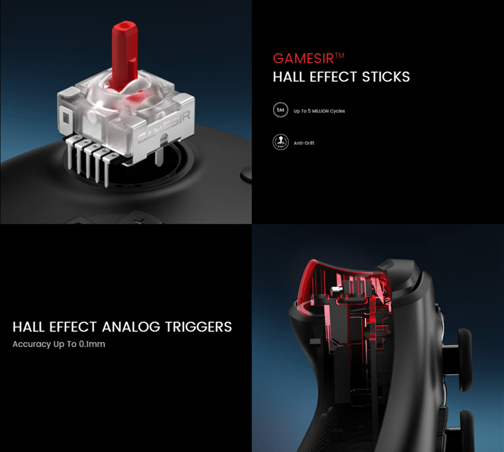 GameSir Hall-effektspakar registrerar rörelser via magnetiska sensorer istället för potentiometrar. Det ger jämnare signal, högre precision och betydligt längre livslängd. Även de analoga avtryckarna använder Hall-effektteknik för exakt och linjär inmatning.