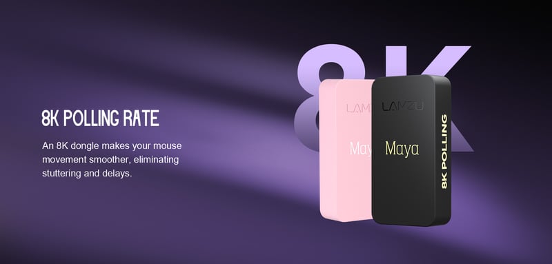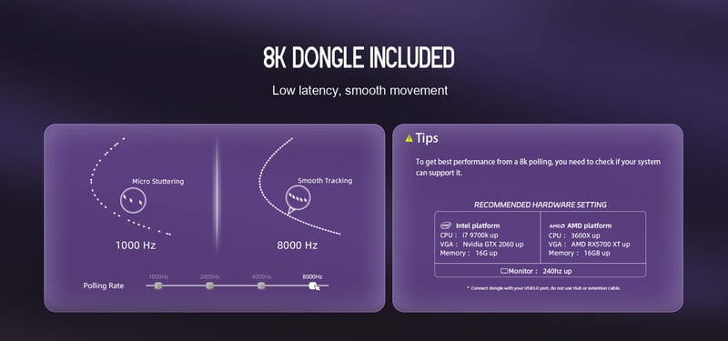 Med 8000 Hz polling-rate via den medföljande 8K-dongeln rapporterar musen position upp till 8000 gånger per sekund. Detta minskar input lag och ger snabbare respons jämfört med traditionella 1000 Hz-lösningar.