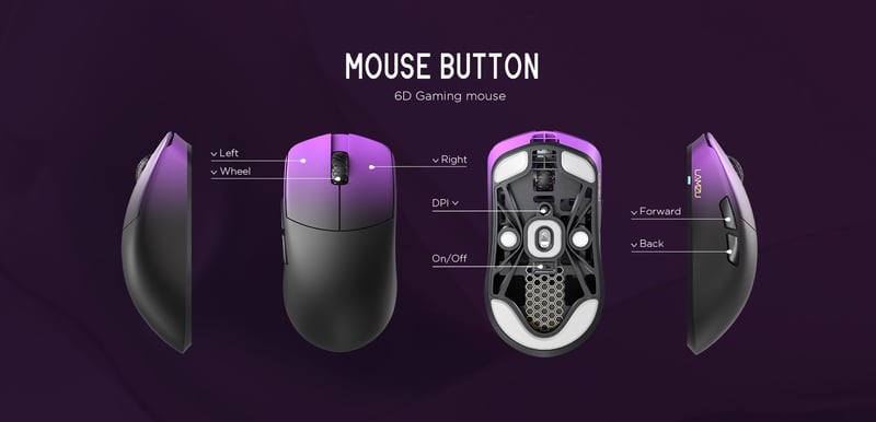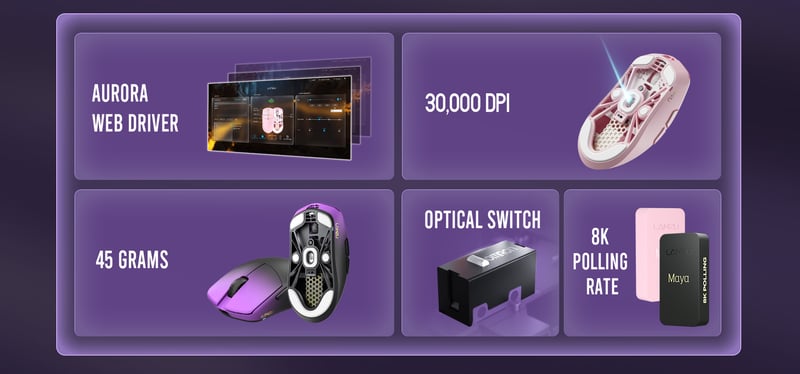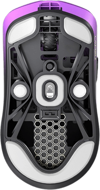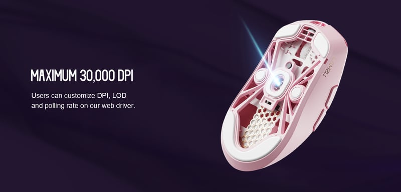 Kärnan i Lamzu Maya Champion Edition Purple Shadow är PixArt 3950, en optisk high-end-sensor med mycket exakt tracking och stabil prestanda även vid höga DPI-nivåer. DPI kan justeras upp till 30 000 för användare som kräver hög känslighet eller spelar på låg sens med stora musrörelser.