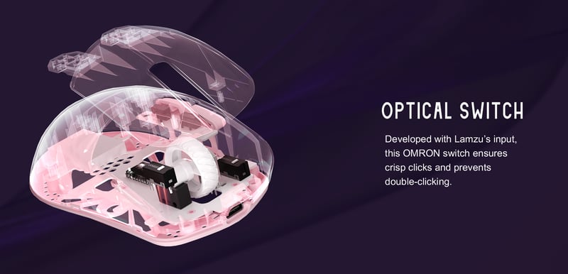Lamzu Maya Champion Edition Purple Shadow är utrustad med optiska Omron-switchar som registrerar klick utan traditionell metallkontakt. Detta minskar debounce-fördröjning och ger snabb, konsekvent aktivering.