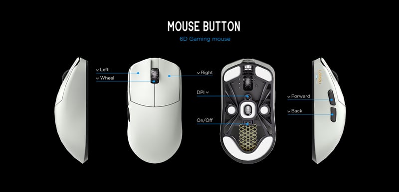 Den integrerade Nordic nRF52840-mikrokontrollern säkerställer stabil trådlös anslutning och effektiv strömhantering. Musen kan även användas via USB-C-kabel för laddning eller trådbundet spel.