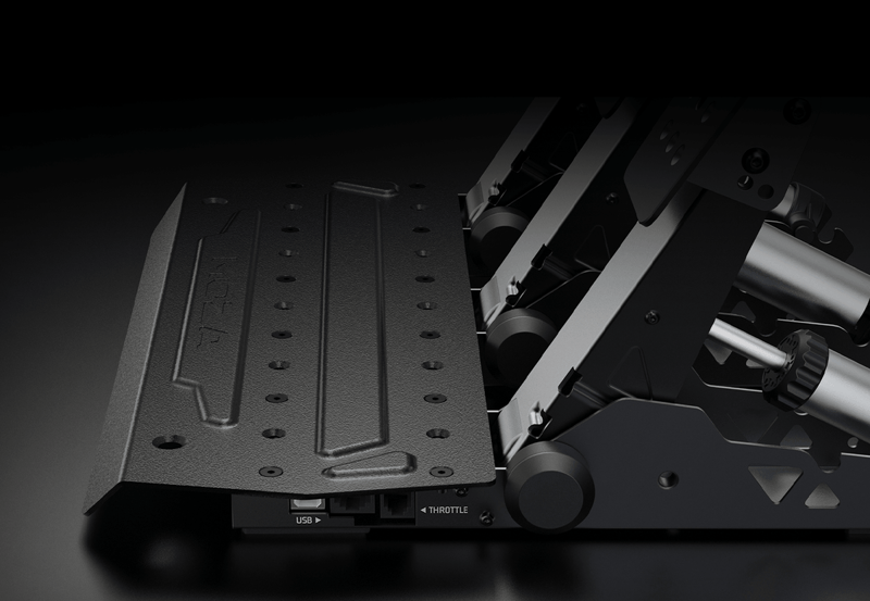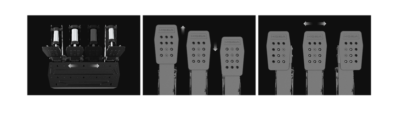 Pedalsystemet använder en elastomerbaserad konstruktion där motståndet kan justeras med olika fjäderhårdheter. Standardkonfigurationen erbjuder upp till 25 olika inställningar, medan ett separat performance kit utökar detta till över 1000 kombinationer. Detta gör det möjligt att efterlikna allt från standardbilar till styva racerbromsar i exempelvis formelklasser.