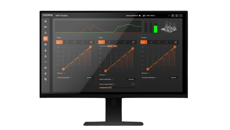 Via MOZA Pit House-programvaran kan du justera pedalernas responskurvor, bromstryckspunkt och signalutgång. Systemet ger även realtidsdata för analys, vilket gör det möjligt att finjustera inställningar baserat på körstil och bana.