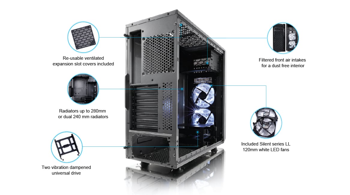 - Two preinstalled Fractal Design Silent Series LL 120mm White LED fans