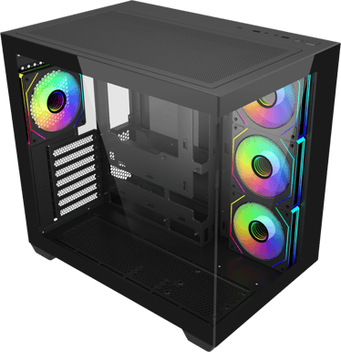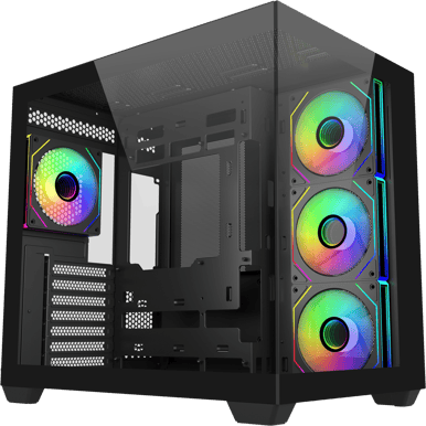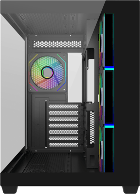 Fyra ARGB PWM-fläktar ingår från start, varav tre är omvända intagsfläktar och en är bakre utblås. Fläktarna kan kedjekopplas och synkroniseras med moderkortets RGB-system för en enhetlig ljusprofil. Detta minskar behovet av extra tillbehör och förenklar installationen.