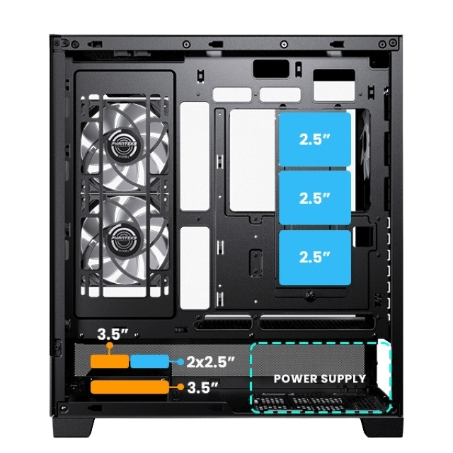 • 3x 120mm fans location in mid plate for direct and dedicated GPU cooling.
