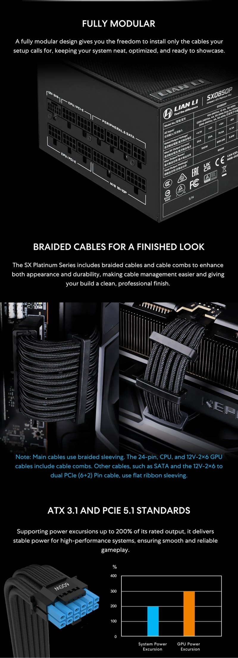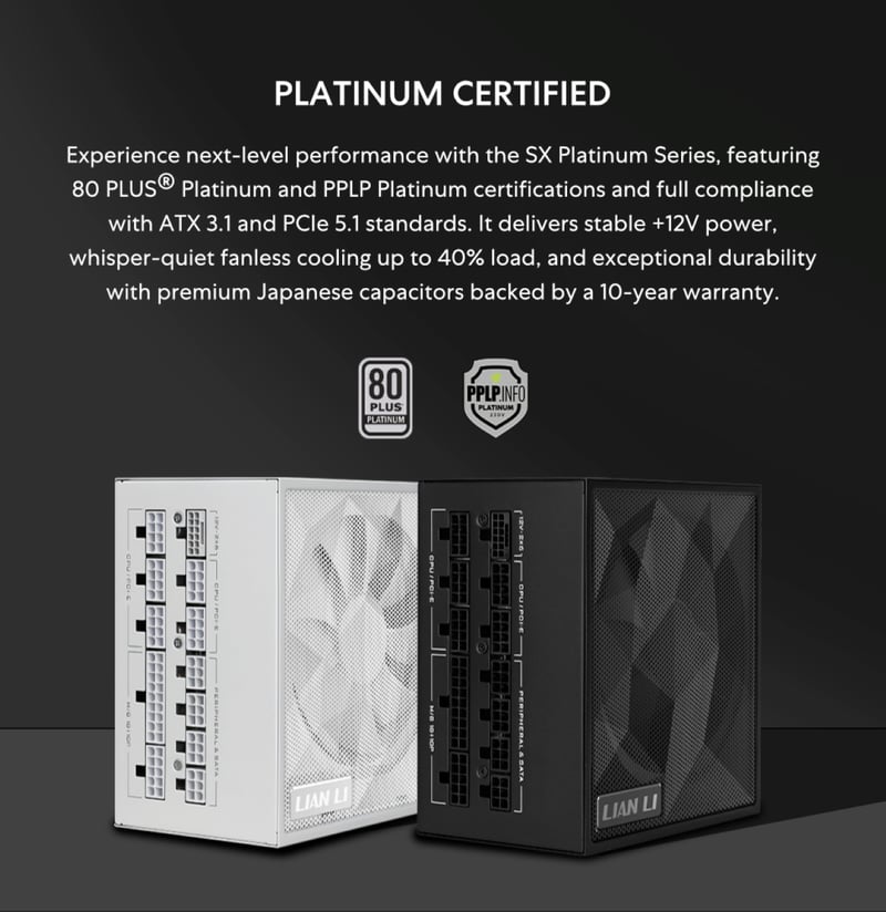 Med PCIe 5.1, förstärkt 12V-2×6-kontakt, 100 % japanska kondensatorer och fläktlöst läge upp till 40 % belastning levererar Lian Li SX Platinum stabil, energieffektiv och tyst drift för högpresterande gaming- och workstation-system.