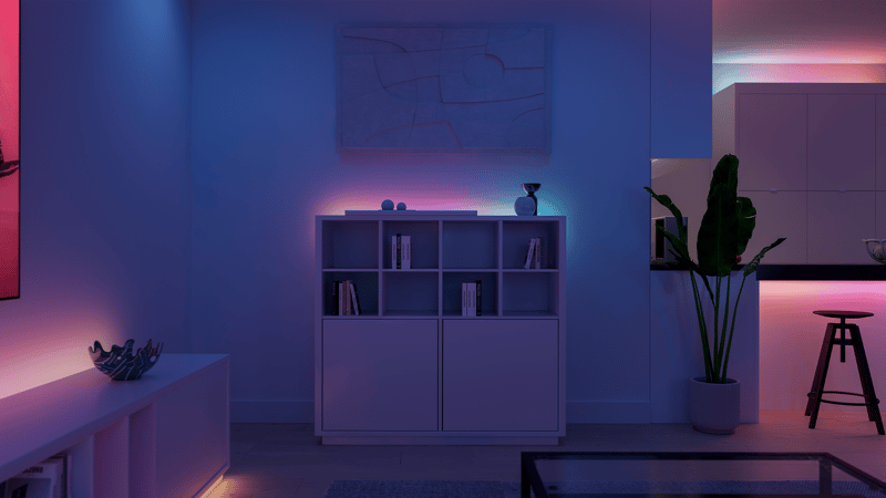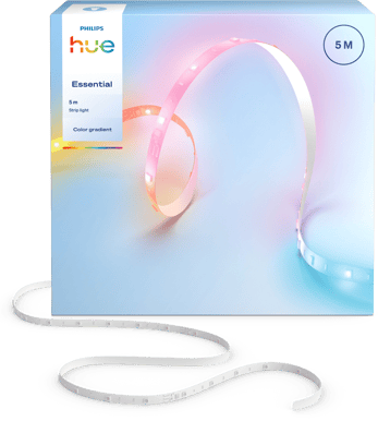 Hue Essential LED list erbjuder justerbart vitt ljus från varmt till kallt, vilket gör det möjligt att växla mellan avslappnande kvällsbelysning och mer energigivande arbetsljus. Utöver detta kan du välja färgat ljus och skapa gradienteffekter som ger mjuka övergångar mellan olika kulörer.