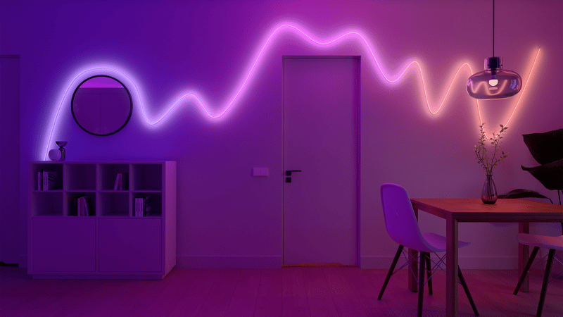 Den formbara designen gör att Hue Essential Flex LED-list kan följa kurvor, vinklar och mönster utan att tappa ljusjämnhet. Det öppnar upp för kreativa användningsområden som att rama in speglar, konstverk eller hyllsystem med en jämn och sammanhängande ljuslinje.