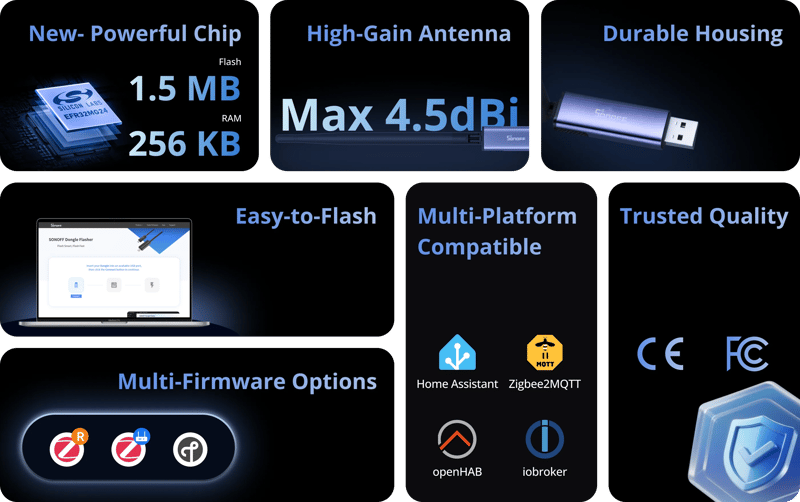 Dongeln levereras med förinstallerad firmware baserad på EmberZNet-protokollstacken men kan enkelt flashas om för andra användningsområden. Med SONOFF Dongle Flasher kan firmware uppdateras eller bytas direkt via webbläsare eller Home Assistant-tillägg.
