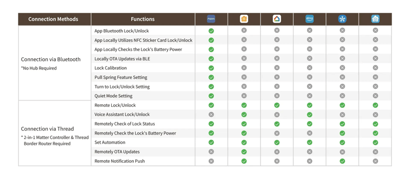 Knacka bara din telefon på det medföljande NFC-kortet för att komma åt appen eller öppna appen direkt för omedelbar upplåsning. Matter över Thread och stöd för alla större Smarta Hem Plattformar.