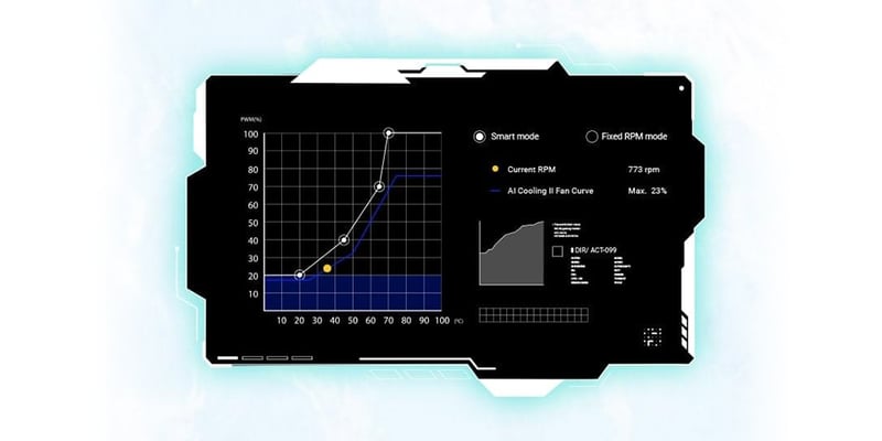 AI Cooling II balanserar termiken och akustiken i alla byggsystem med ett enda klick. En exklusiv ASUS-algoritm minskar onödigt ljud medan den kör ett snabbt stresstest, och sedan övervakar den CPU-temperaturer för att dynamiskt justera fläktarna till optimala hastigheter.