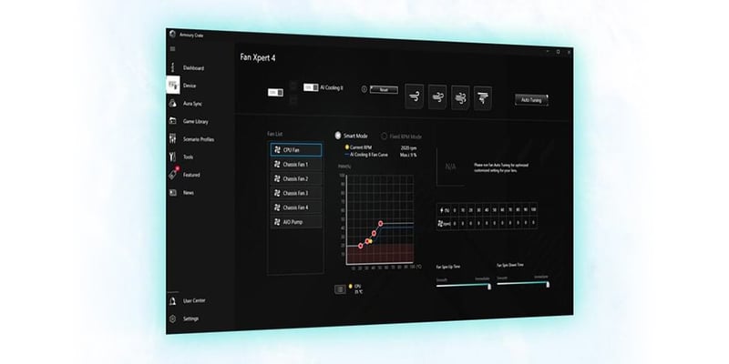 ASUS Fan Xpert 4-programvaran ger omfattande kontroll över fläktar och AIO-kylare. Auto-Tuning-läget konfigurerar inställningar med ett klick, medan Extreme Quiet-läget minskar fläkthastigheterna för tyst drift under lätta uppgifter. Kontrollerna är också tillgängliga via UEFI BIOS.