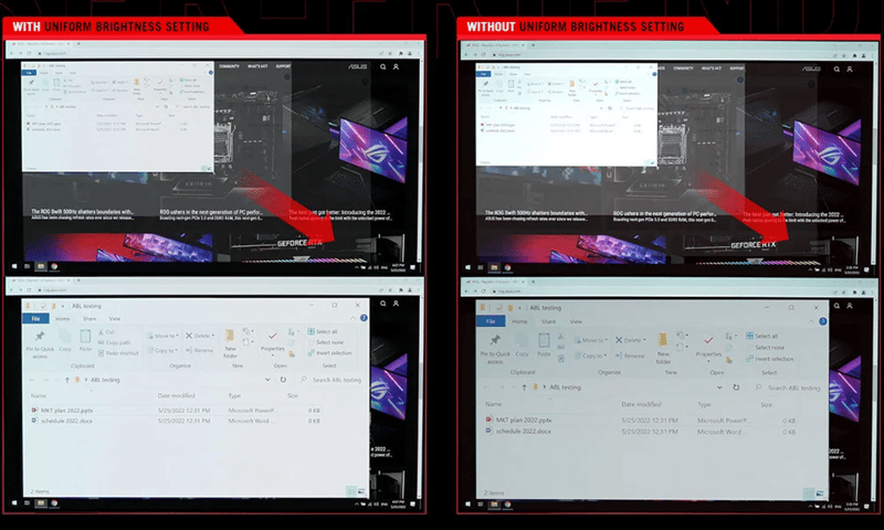 När den är aktiverad minskar den ROG-exklusiva inställningen Uniform Brightness i OSD-menyn den högsta ljusstyrkan för att hålla nivåerna konsekventa för bättre visning, även när storleken på ljusa vita fönster ändras. Det gör också maratonspelsessioner mycket mer behagliga för ögonen.