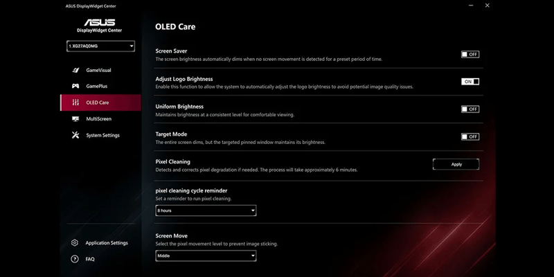 ASUS OLED Care ger påminnelser om pixelrengöring i rätt tid, en skärmsläckare, en skärmflyttningsfunktion och mer för att skydda OLED-panelen och säkerställa skärmens livslängd.