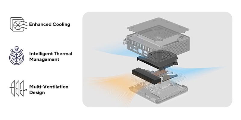 ASUS NUC 15 Pro har en avancerad termisk design med dubbla värmeledningsrör, intelligent termisk hantering och strategiskt placerade ventilationsöppningar, vilket garanterar effektiv och tyst värmeavledning.