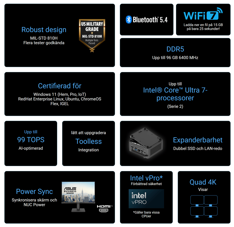 Mekanisk kompatibilitet är kärnan i ASUS NUCs. Vi har utvecklat mer användarvänliga uppgraderingar och mångsidiga NUC:er/kit med olika expansionsalternativ, inklusive: