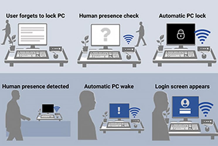 Integrerad närhetssensorteknik känner av användarens närvaro och låser eller väcker CPU:n för att garantera datasäkerheten.