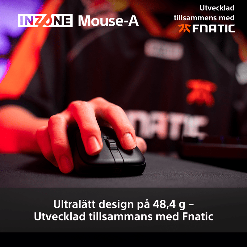 Med en vikt på bara 48,4 g är INZONE Mouse-A tillräckligt lätt för blixtsnabba rörelser samtidigt som den bibehåller tillräckligt med vikt för exakt kontroll. Denna ultralätta design hjälper till att minska trötthet och håller din hand snabb och ditt sinne skarpt, även under långa sessioner.