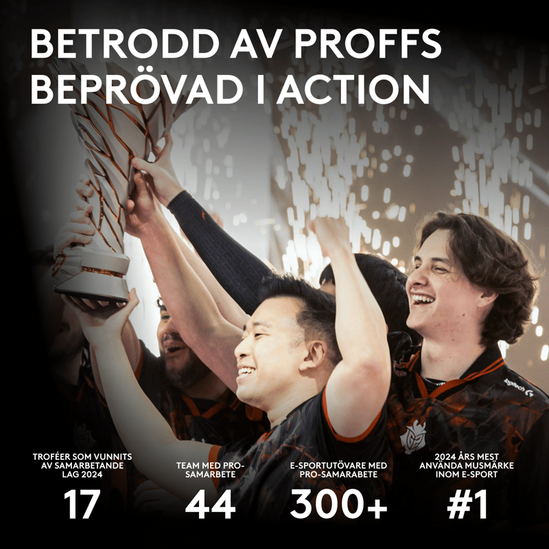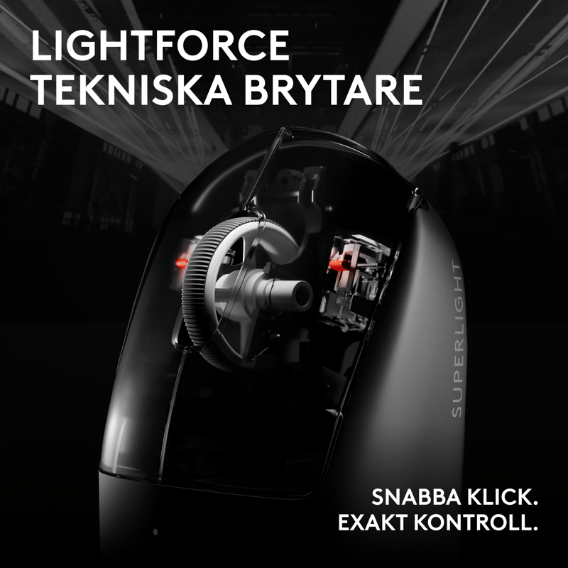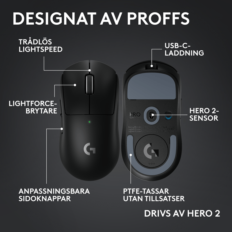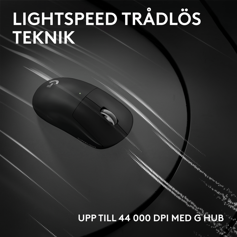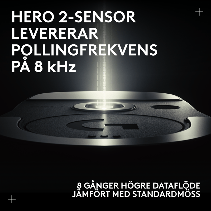 Obs! Avancerade funktioner kräver Logitech G HUB-programvara. Batteritiden kan variera beroende på datormiljö och användning vid konstant rörelse.